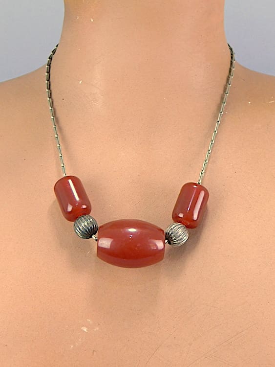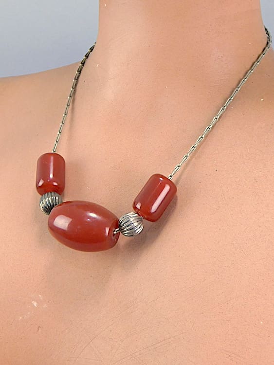 Early 1930’s amber galalith and chrome necklace by Jakob Bengel. Fitted with a screw clasp.