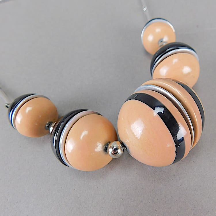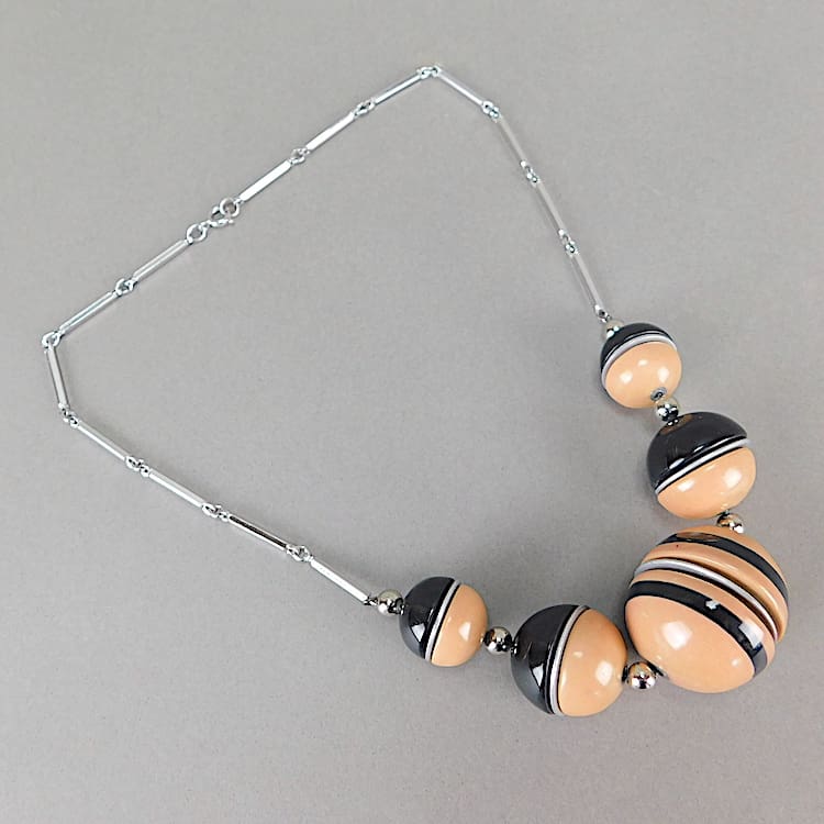 Peach and black galalith chunky modernist balls necklace.
