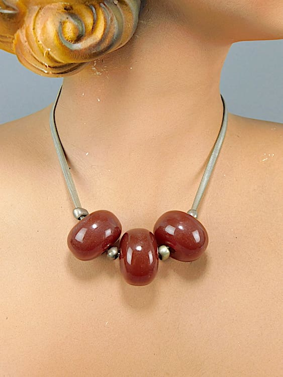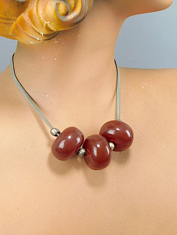 Chunky amber coloured phenolic beads strung on a flat snake chain.