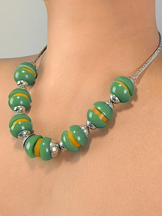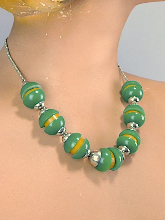 Early 1930’s German chrome, green and yellow galalith necklace by Jakob Bengel.