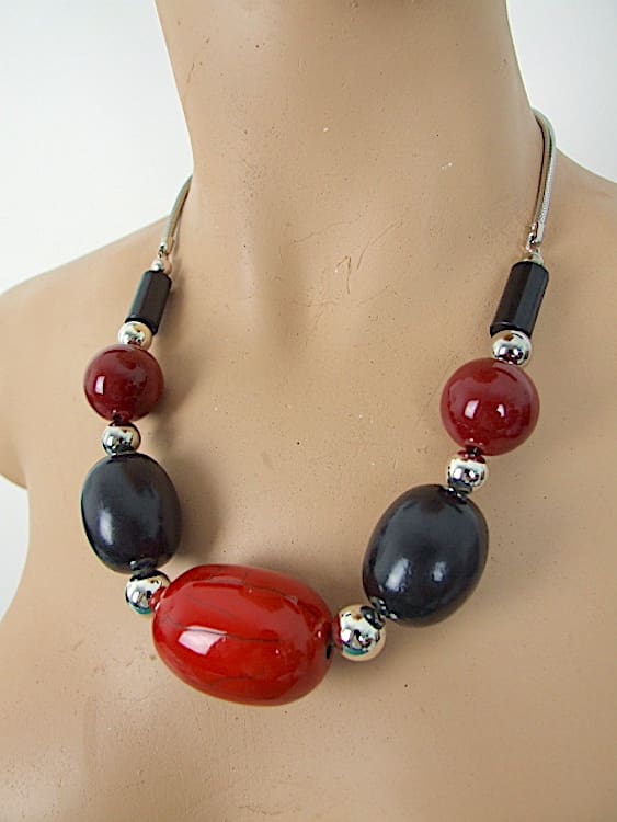 Black and red galalith chunky bead necklace made in the early 1930’s. The central red bead has black striations.