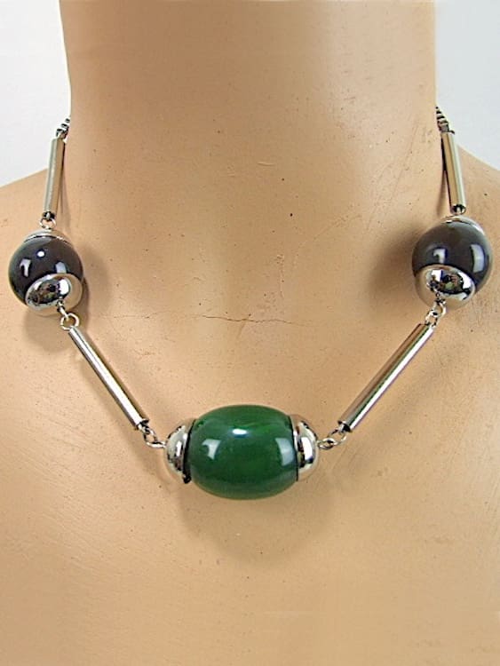 Black and green galalith and chrome cup necklace. Made by Bengel in the early 1930s and in unused condition.