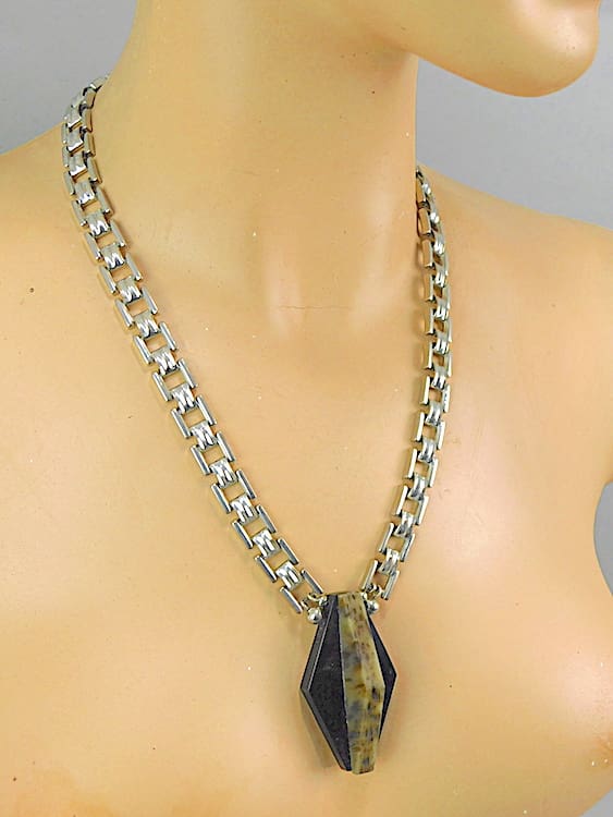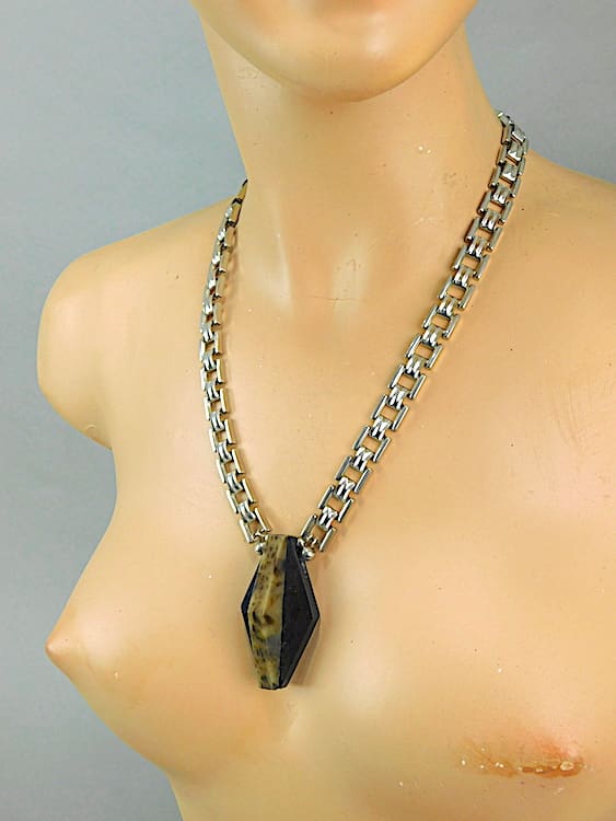 Large square chain necklace with huge central green tortoise shell and black galalith pendant.