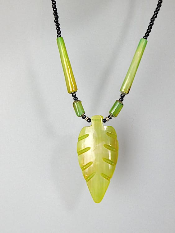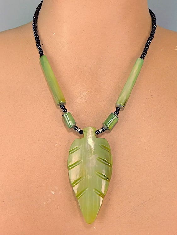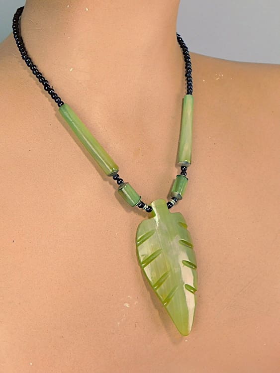 Chunky vivid green carved phenolic leaf necklace. Fitted with a screw clasp.
