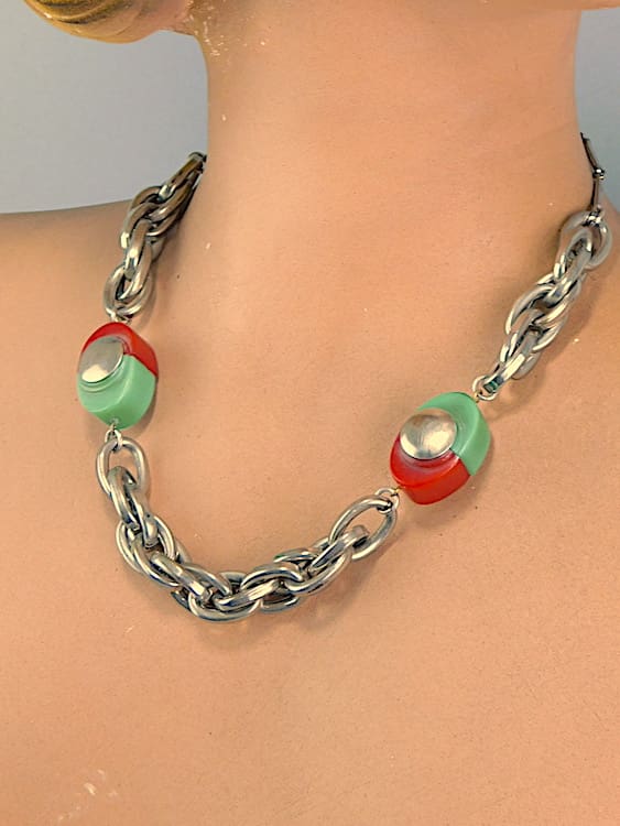 Stunning modernist large chrome multi links with two red and green galalith and chrome ovular beads. Made by Jakob Bengel in the early 1930’s.