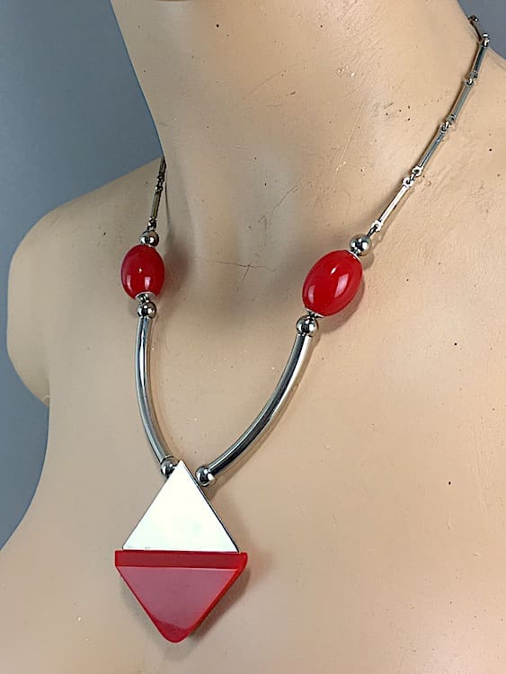 Chunky chrome pendant panel with red galalith lower section and balls, made in the early 1930’s by Jakob Bengel. Central pendant section measures 2.25 inches square.