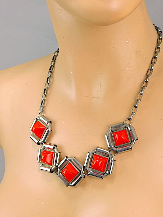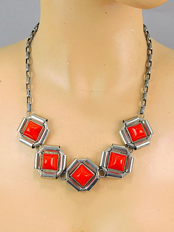 Early 1930’s red galalith and chrome necklace by Jakob Bengel.