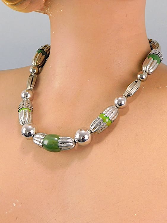 Two tone green galalith and fluted chrome piece, made by the Jakob Bengel factory in Germany. Fitted with a screw clasp.