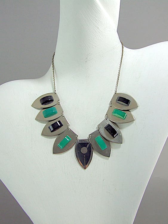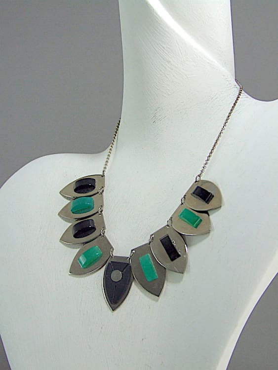 Stylish black and green galalith and chrome shields necklace made by Jakob Bengel in the early 1930’s.