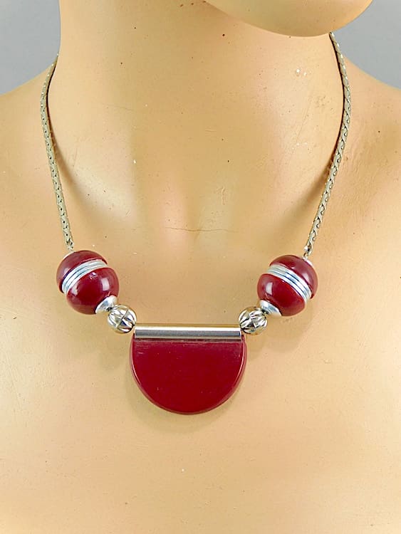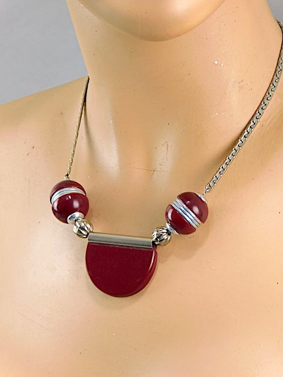 Made in the early 1930’s, with burgundy galalith balls and semi circle and chrome discs and chain.