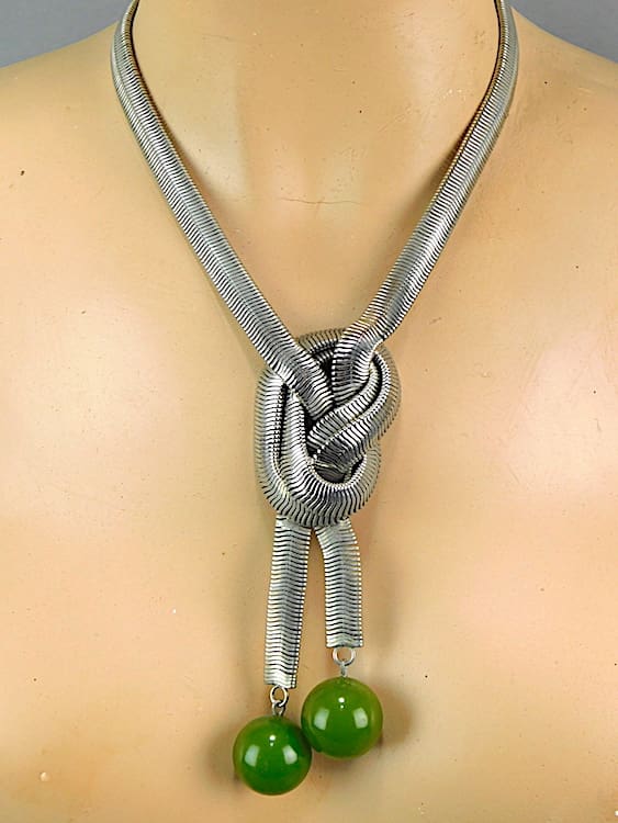 The largest of the snake chains, this one with a double knot and large green galalith balls.