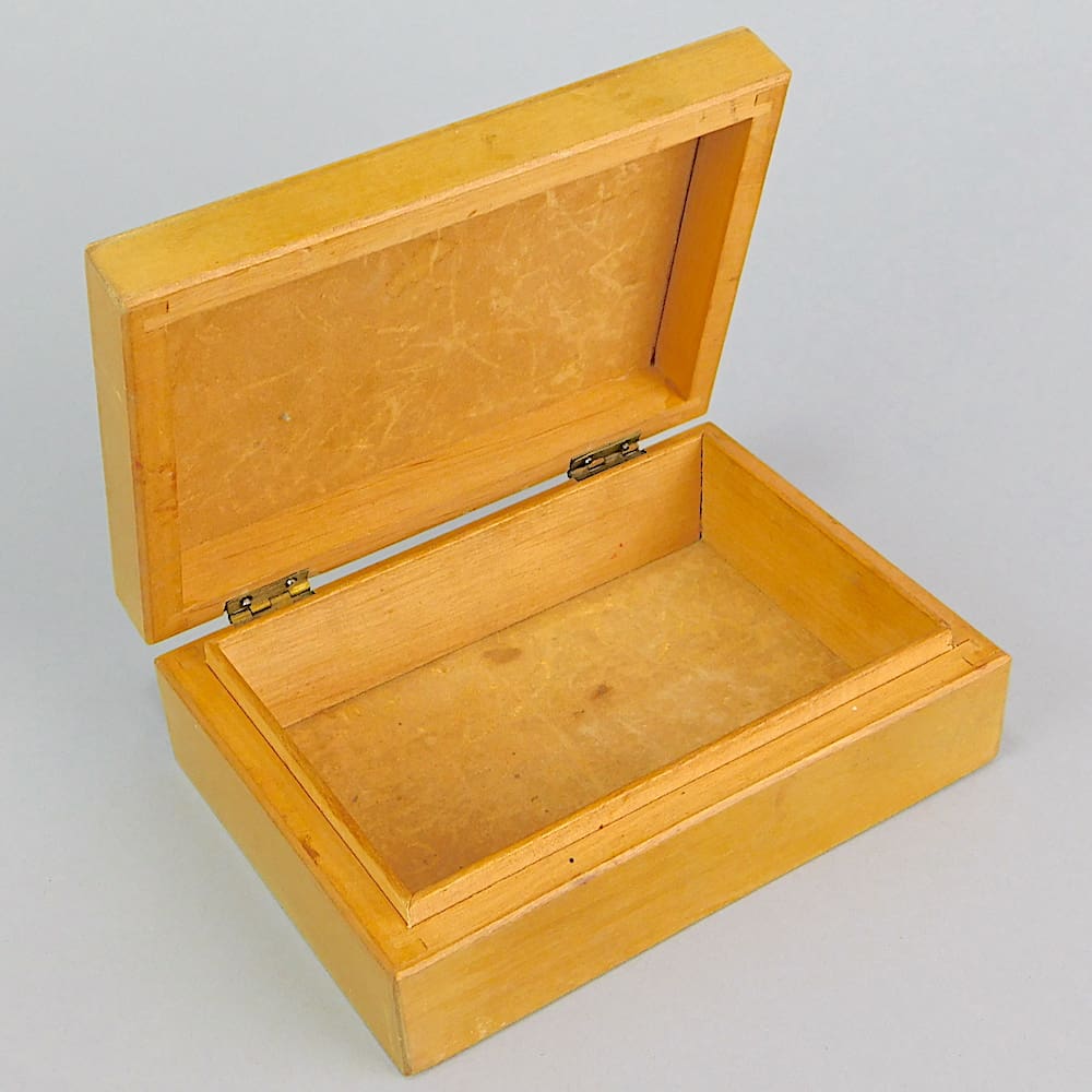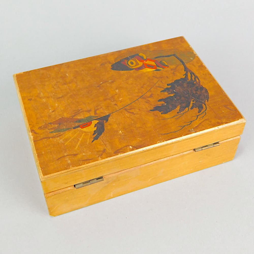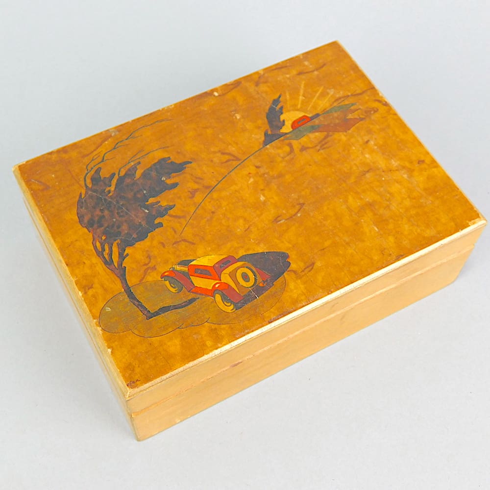 French wooden box probably a cigarette box depicting art deco era cars to the lid. I believe the scene is painted rather than inlaid into the walnut veneer and is then lacquered.