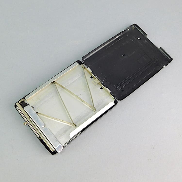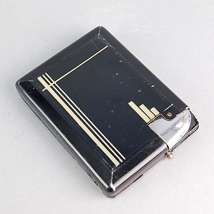 Black enamel cigarette dispenser. Place your cigarettes in the compartment and simply slide the lever to dispense a cigarette. unfortunately the lighter part of the item appears to be stuck shut.