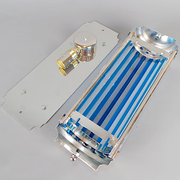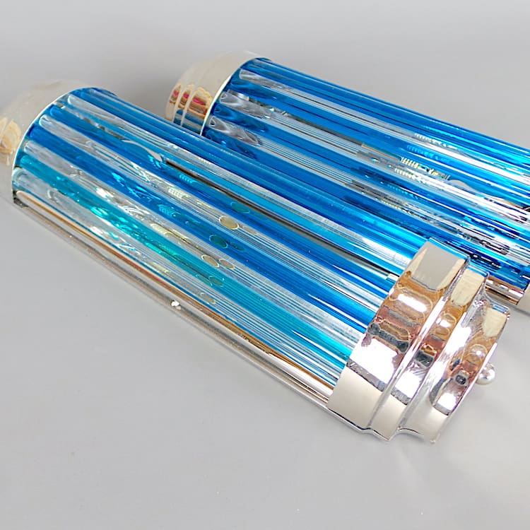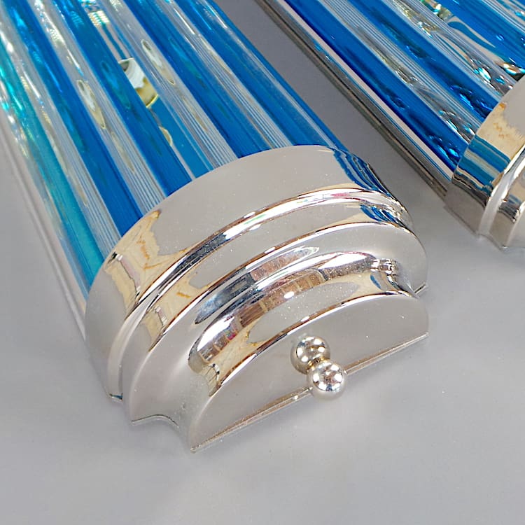 A pair of stylish chrome wall lights with blue and clear glass rods.