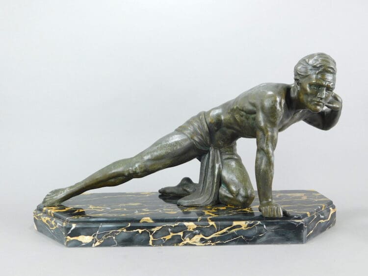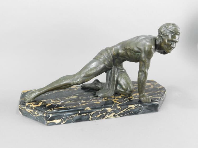 A French spelter male figure, signed on the base ‘Cipriani’. The base is of stepped Portorro marble.