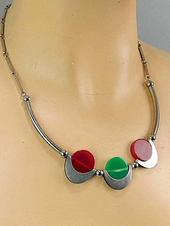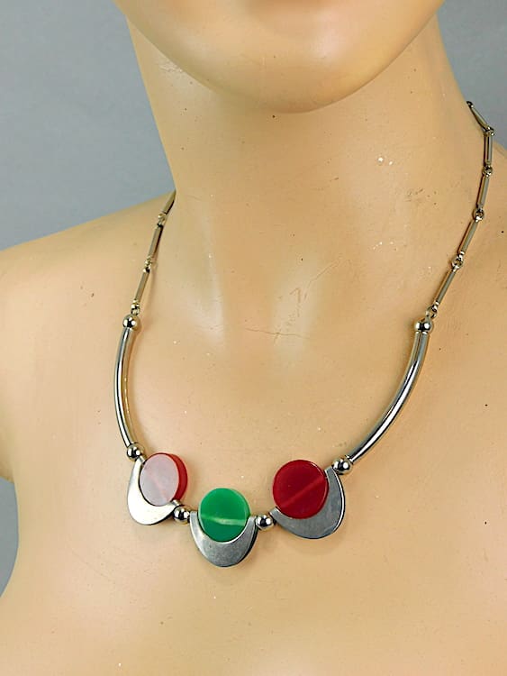 Early 1930’s red and green galalith and chrome circles necklace.