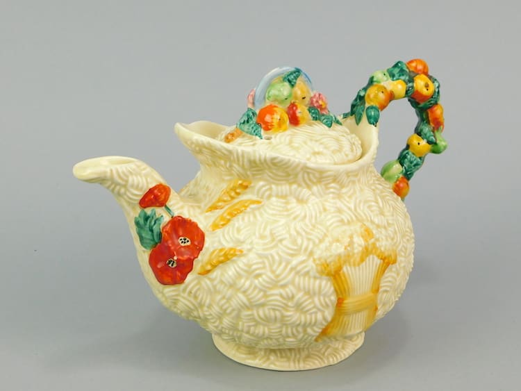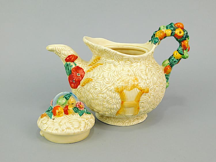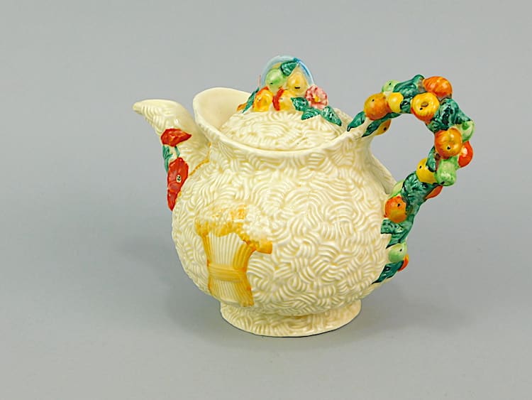 This teapot was designed by Clarice Cliff and is part of her Celtic Harvest range and is marked to the base – Newport Pottery and Clarice Cliff.