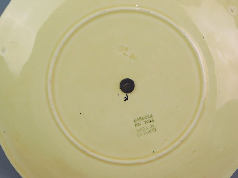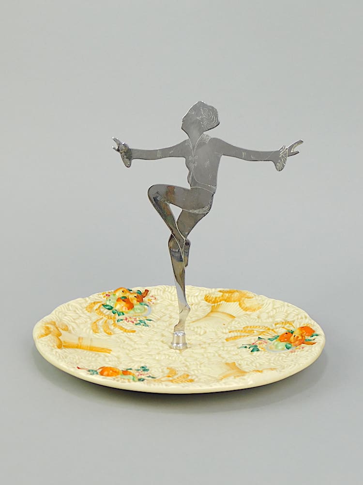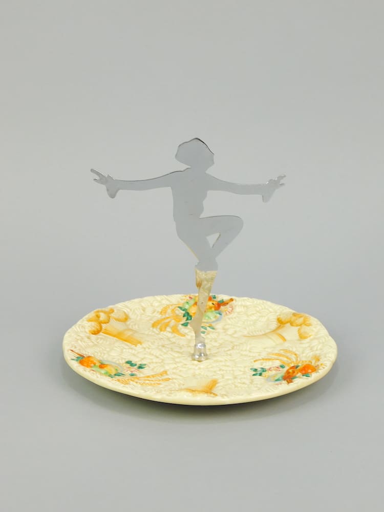 An English cake plate by Clarice Cliff with 2 dimensional chrome deco lady dancer handle. Part of the Celtic Harvest range, this one stamped Barbola – as were many of the Celtic Harvest pieces.