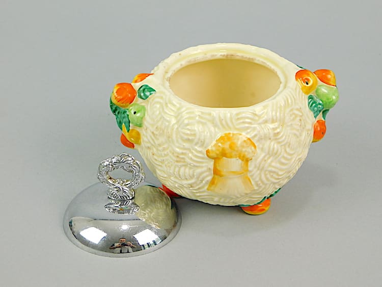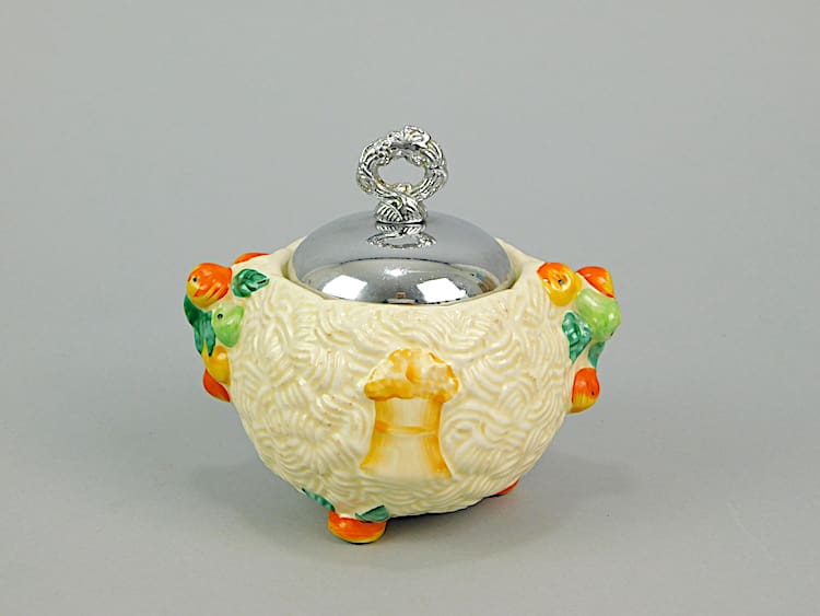 Jam pot by Clarice Cliff. Newport Potteries Celtic Harvest jam pot with chromed lid and bearing the Clarice Cliff signature and relevant markings to the base.