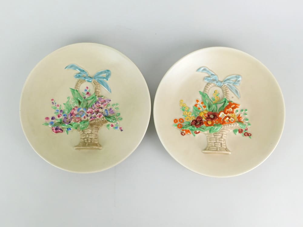 Basket of flowers wall plate in mushroom glaze by Clarice Cliff. Signed to the reverse, Clarice Cliff, Newport Potts. Makes an excellent pair with Plq6 (see pics). Made to be hung on a wall.