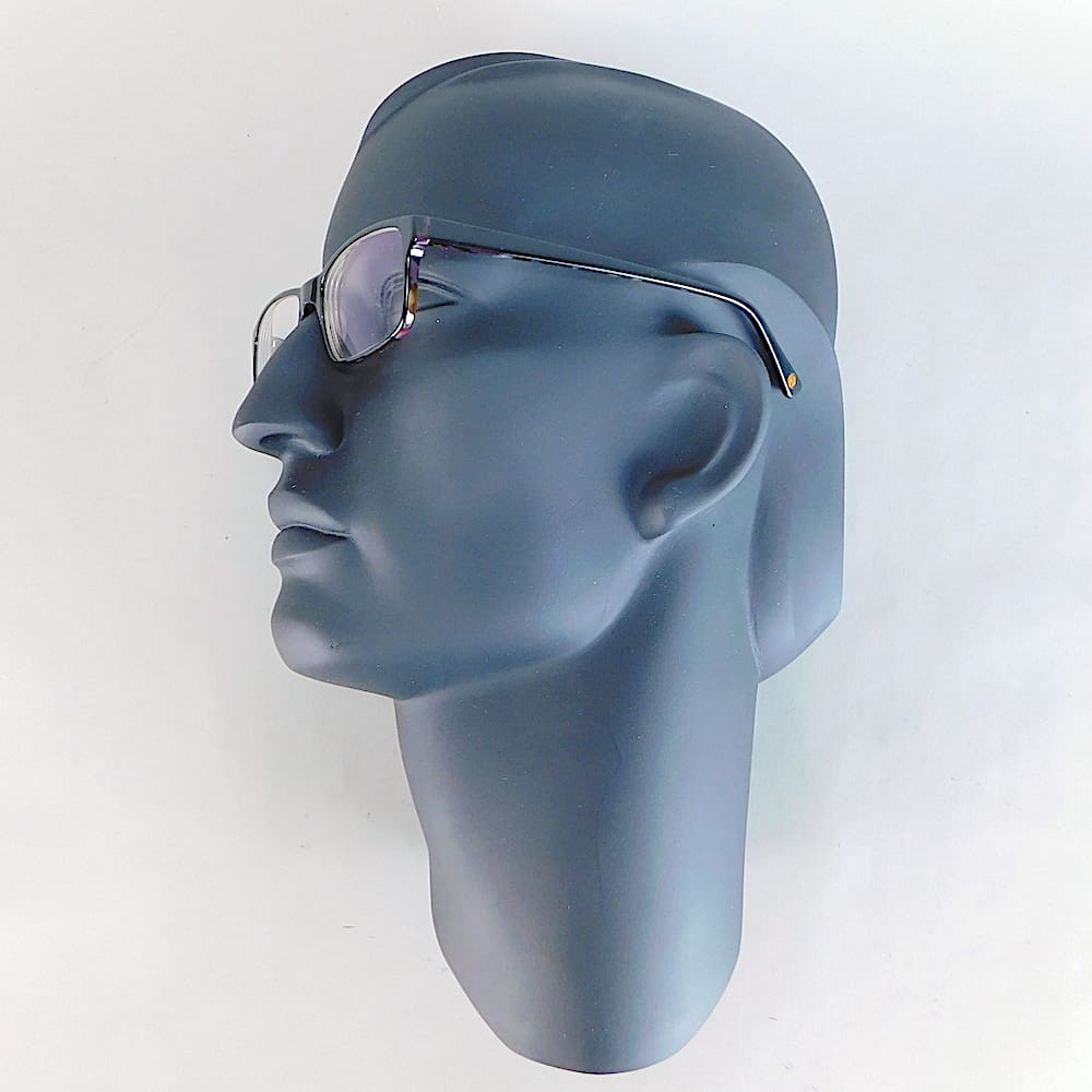 There is a channel to the back, ridge to the nose and high cheek bones in order to support glasses frames (Not Included) and an inverted panel to the back to hang him on a nail.