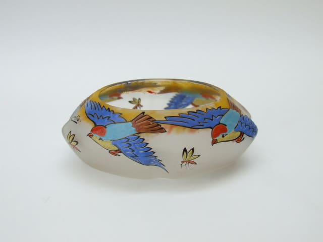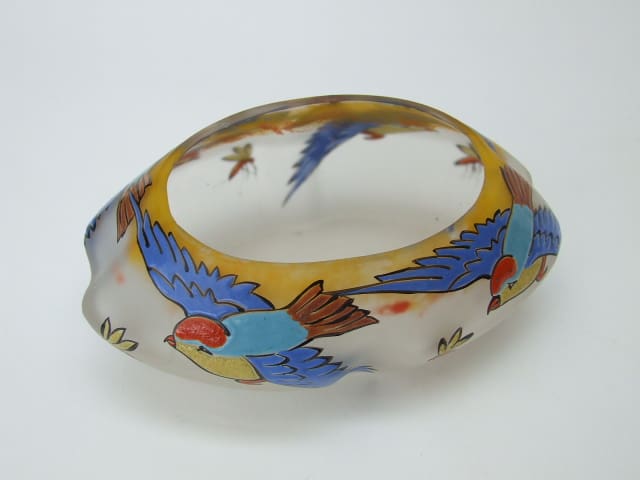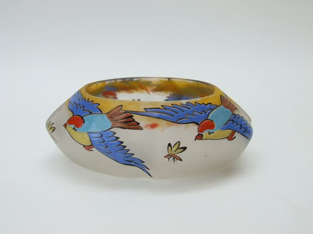 French frosted glass dish with beautifully hand painted birds and dragonfly pattern in vivid thick enamel paint. It was made in the late 1920’s and is signed by the artist Clio.