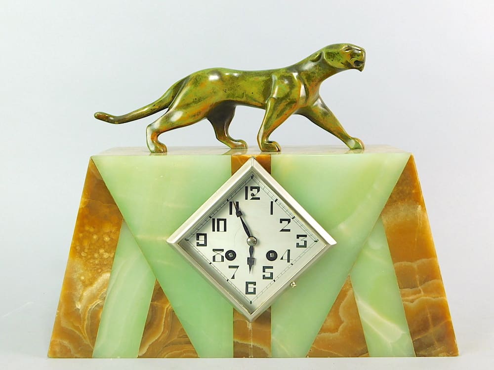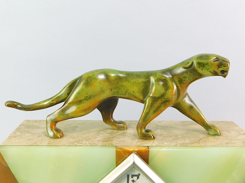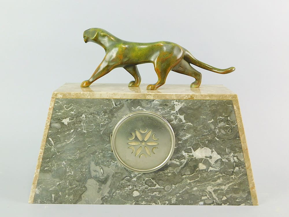 A French art deco bronze panther clock set with sun ray detail to the marble front. Unsigned but by Michel Decoux (1837-1924). Consisting of a clock and two matching side pieces. Marked bronze to the figure.
