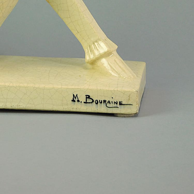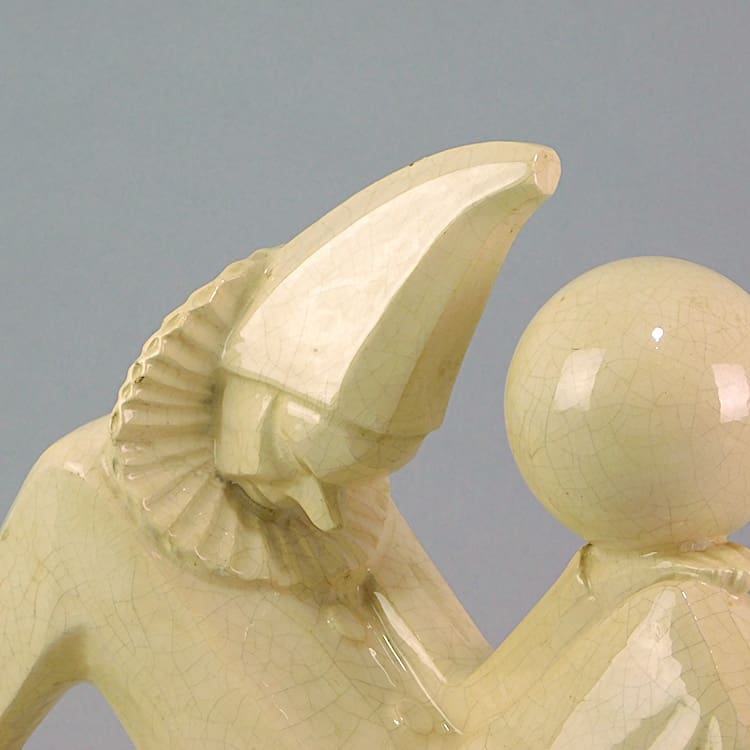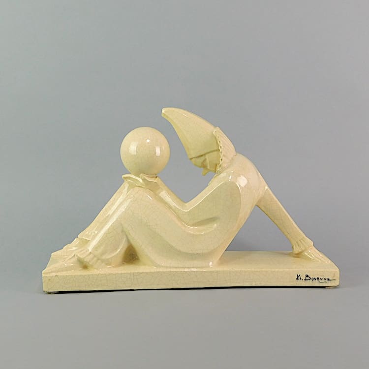 French cream ceramic craquelier of Clown a la Boule by Marcel Bouraine. Made in the late 1920s by the Le Verrier foundry and signed to the base M. Bouraine. This same statue was made by Le Verrier in art metal as a table lamp.
