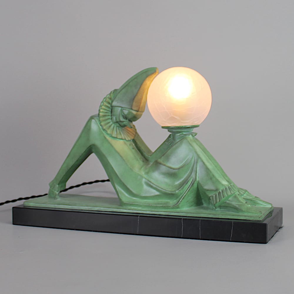 Patinated spelter cubist clown art deco table lamp.