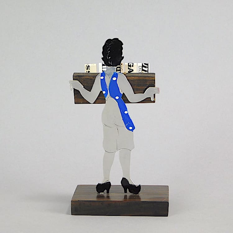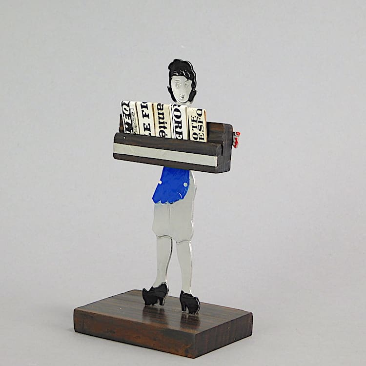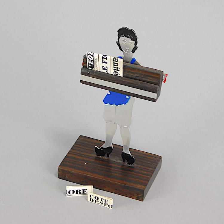 French two dimensional lady newspaper seller in chrome and enamel painted metal, mounted on a macassar wooden base. An unsigned Sudre. There are 6 metal newspaper glass markers to slot on the side of a cocktail glass.