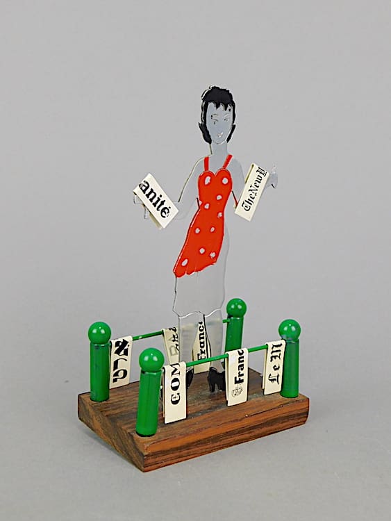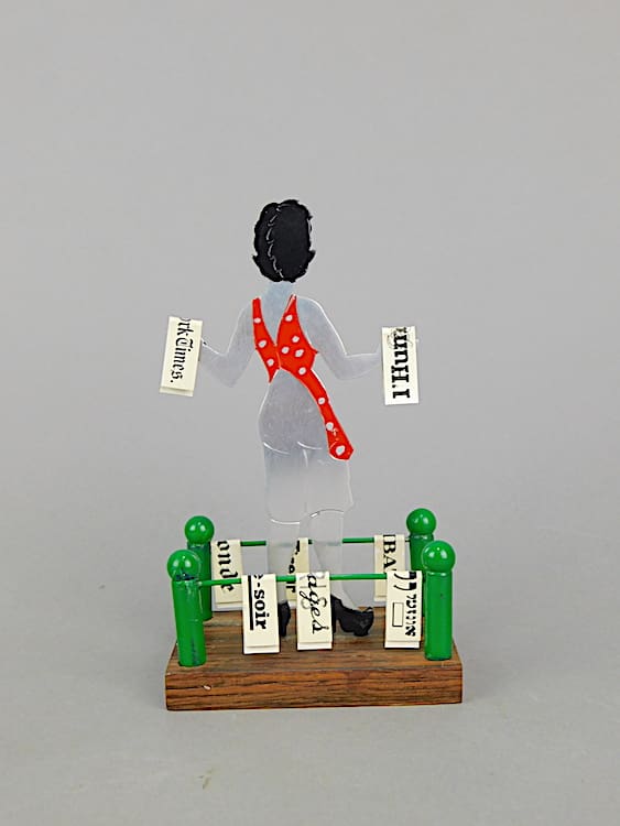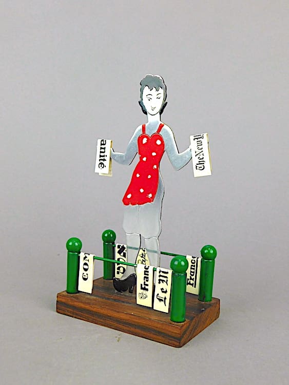 French two dimensional lady newspaper seller in chrome and enamel painted metal, mounted on a wooden base. Signed Sudre to the back of the lady. There are 8 newspaper glass markers to slot on the side of a cocktail glass.