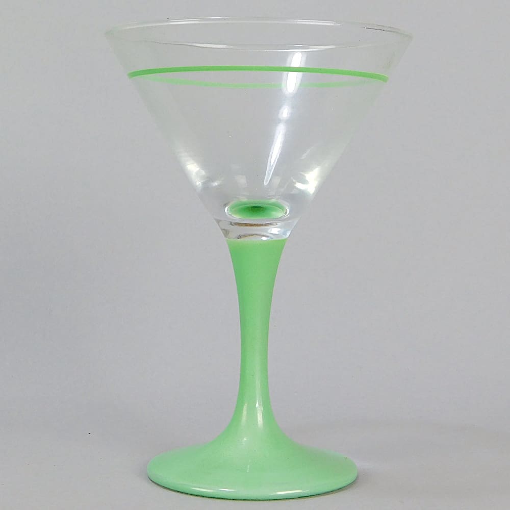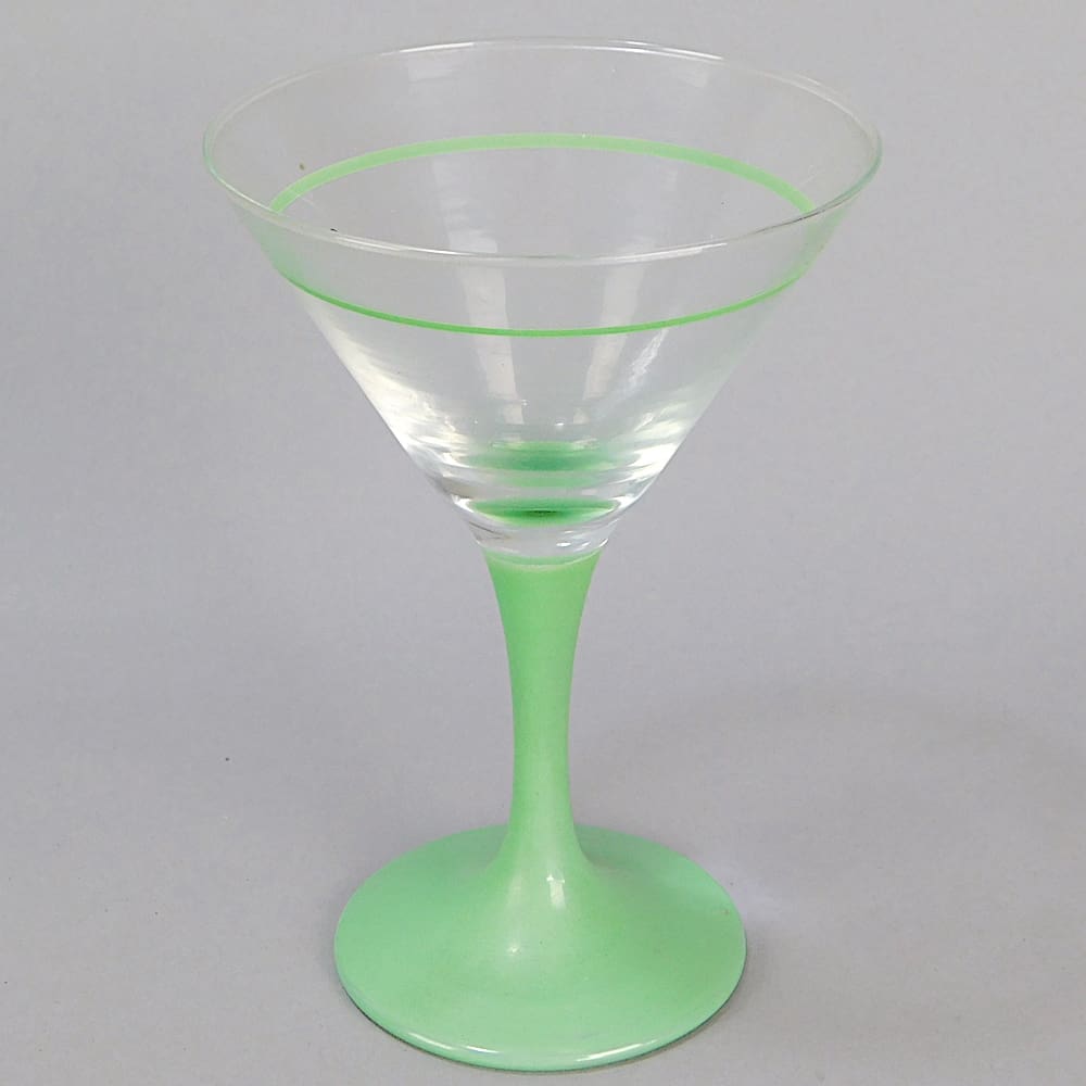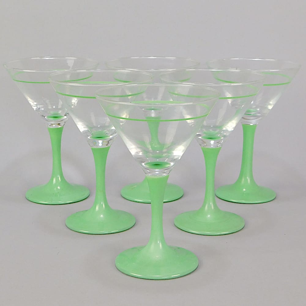 A set of 6 English art deco cocktail glasses with green stems and a green line painted around the glass.