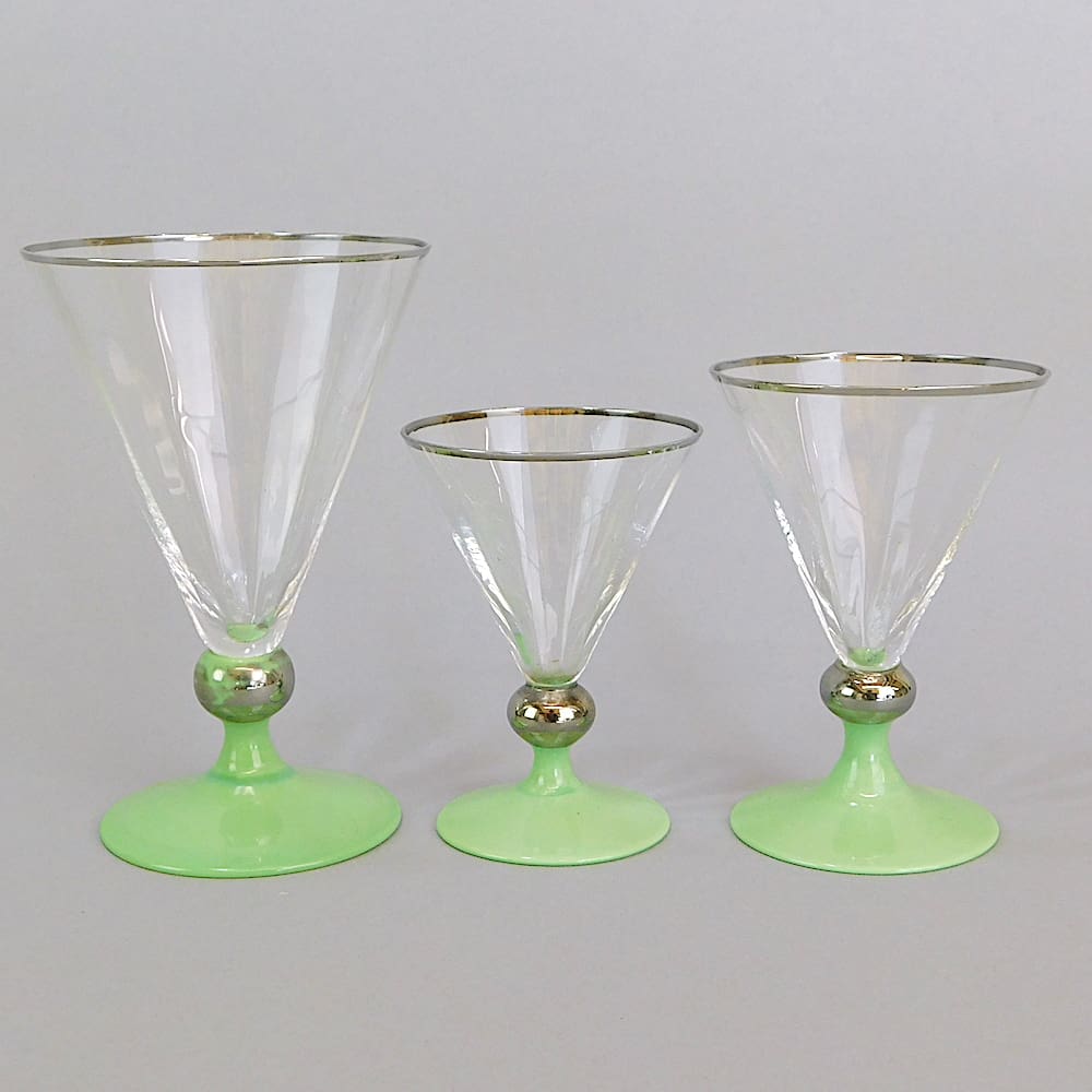 A set of 10 English art deco cocktail glasses of varying sizes.