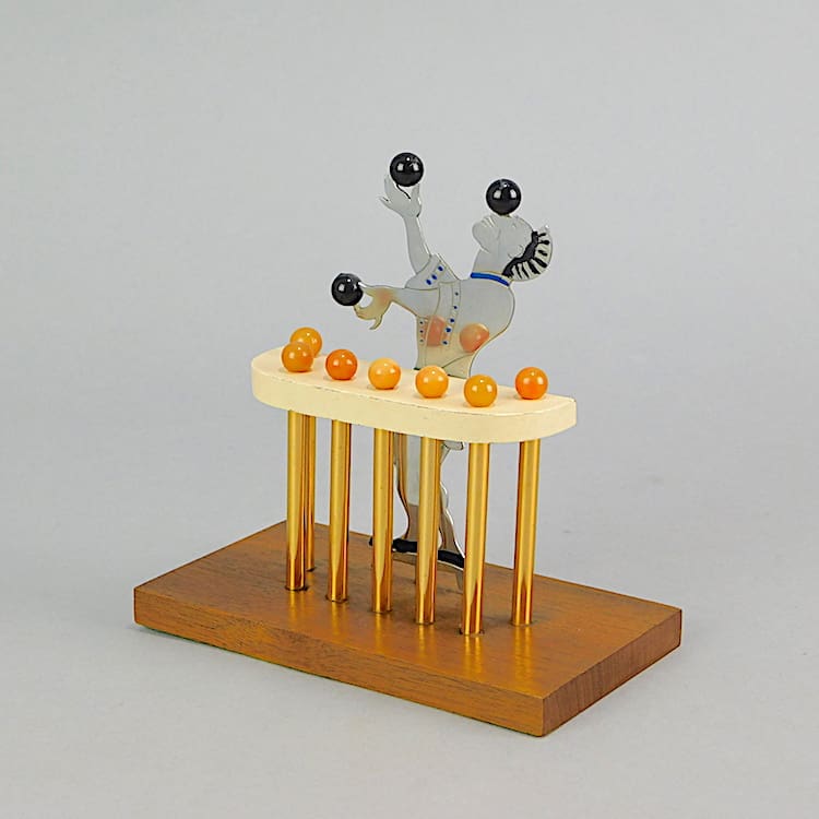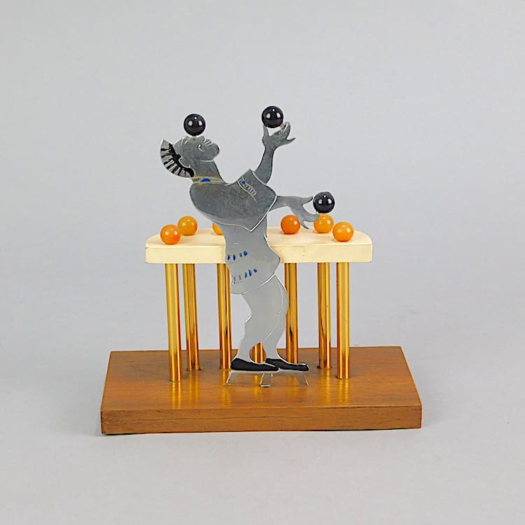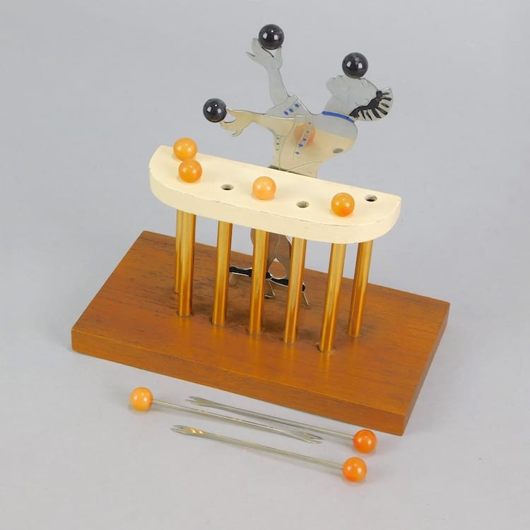 French cocktail sticks set, mounted on a wooden base. A clown/juggler stands behind a bar which holds the cocktail sticks on the end of each stick are his juggling balls. Signed to the back of his leg Sudre and stamped to the base Cado.