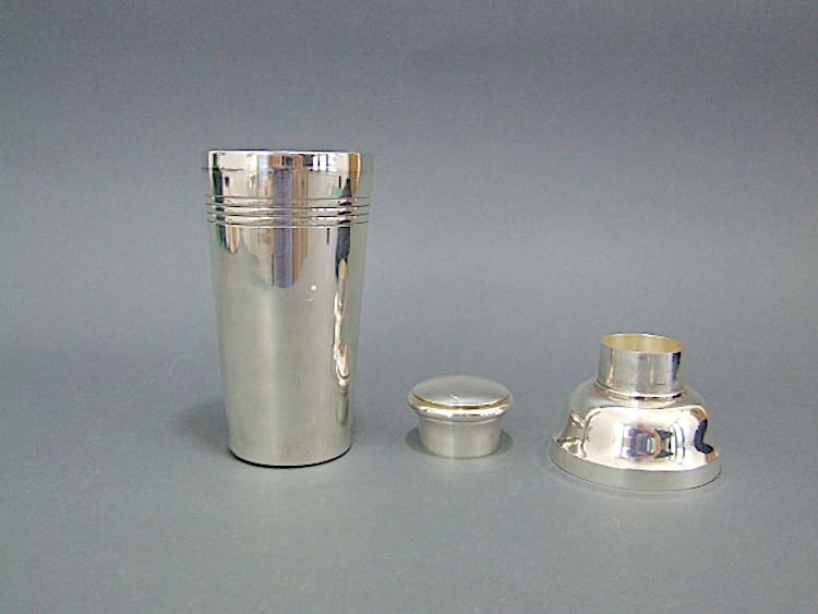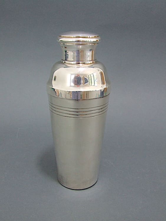 Silver plated art deco cocktail shaker. Designed by and signed Lanel under the base.