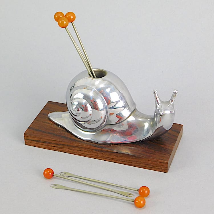 French chromed metal snail on a macassar wooden base with phenolic handles cocktail sticks.