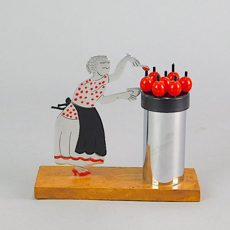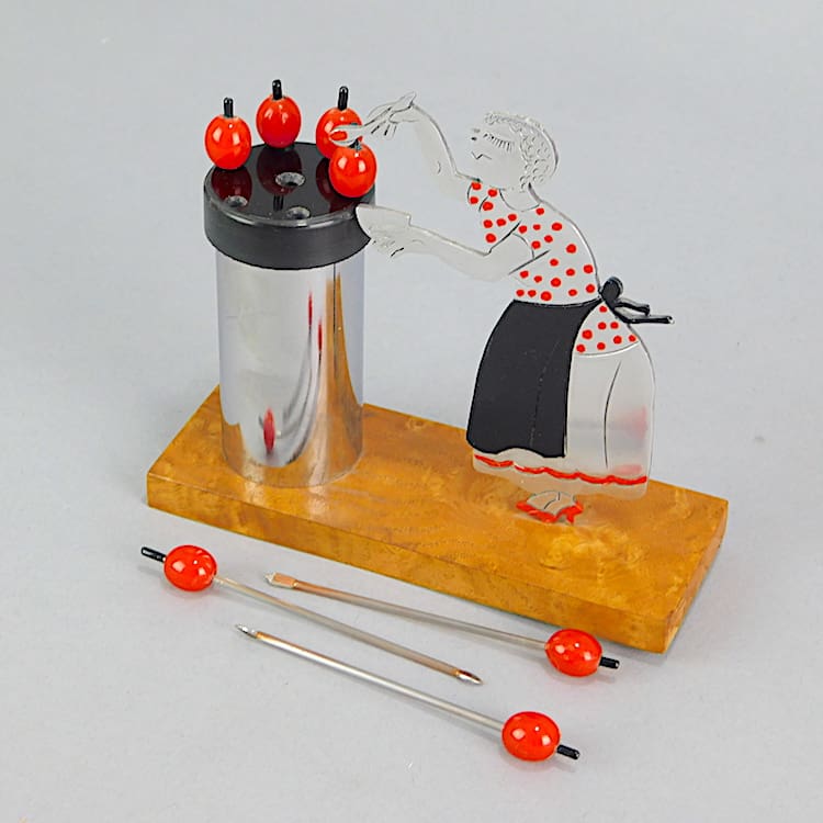 French macassar based cocktail sticks set. Unsigned but undoubtedly by Sudre. The plums the lady is glazing are the cocktail sticks.
