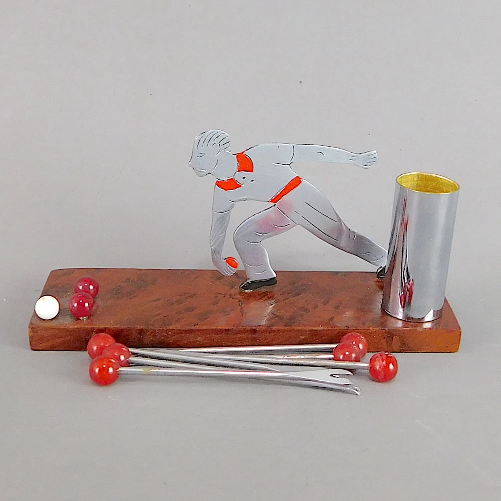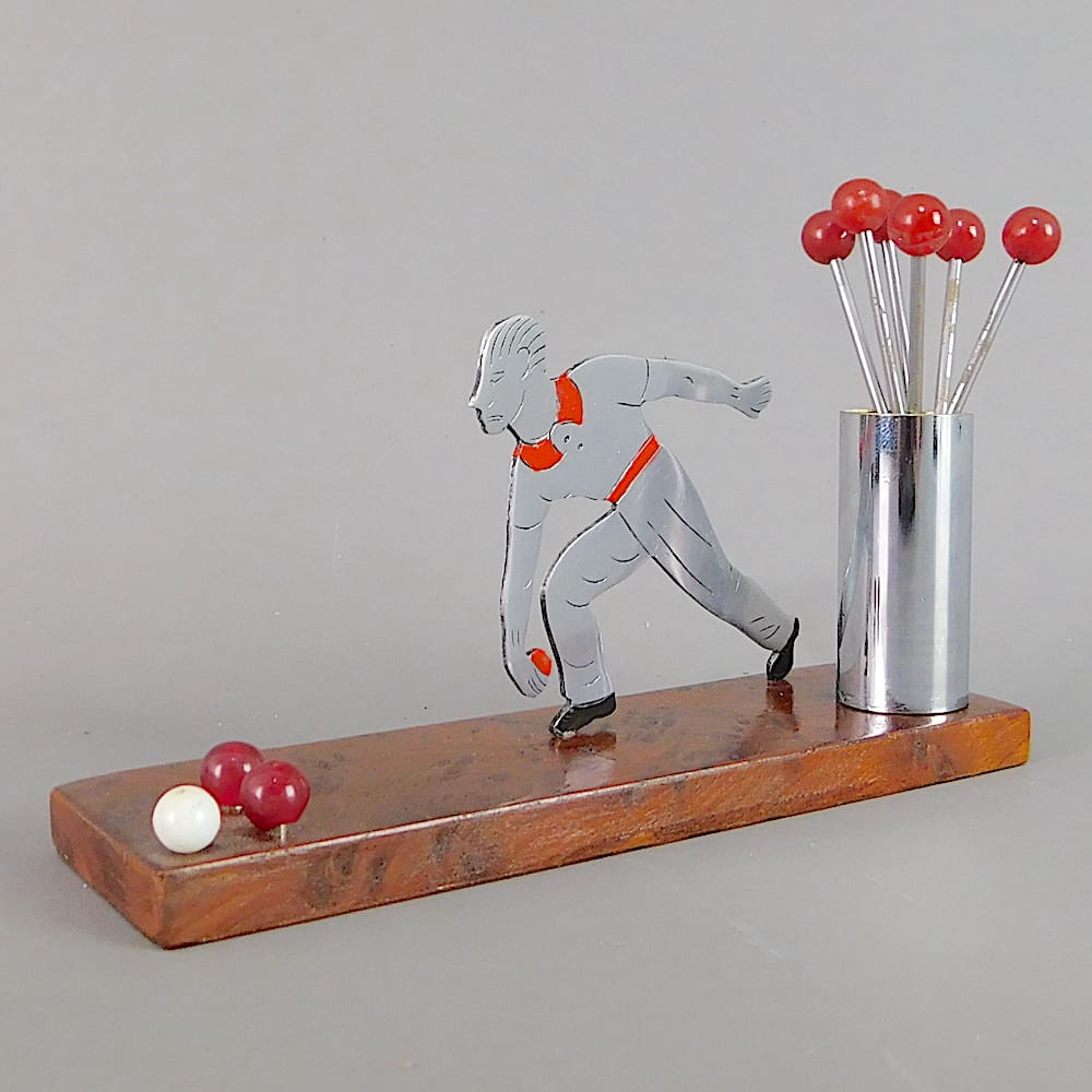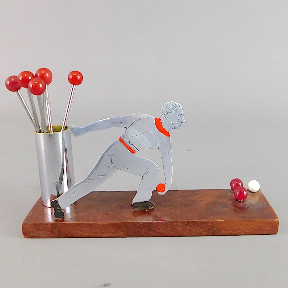 Novelty French hand painted two dimensional man playing boulet on a wooden base. The cocktail sticks have phenolic handles and are in the pot to one end. Unsigned but undoubtedly by Sudre.