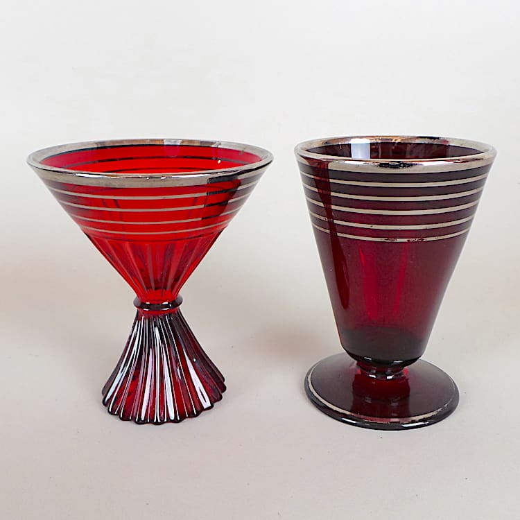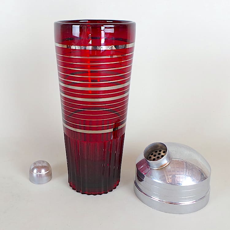 Another stylish ribbed glass cocktail shaker and glasses set in red glass and chrome metal lid with a tray.