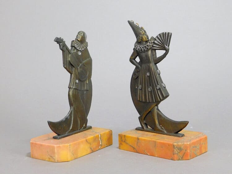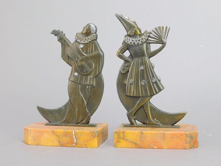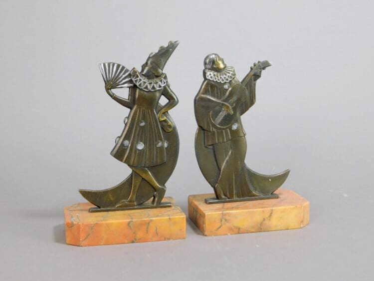French bronze 2-dimensional flat bookends of a Columbine & Pierotte standing in front of half-moons with the man playing the guitar and the lady holding a mask and fan. Bases are of sienna marble, and although unsigned possibly by Janle.