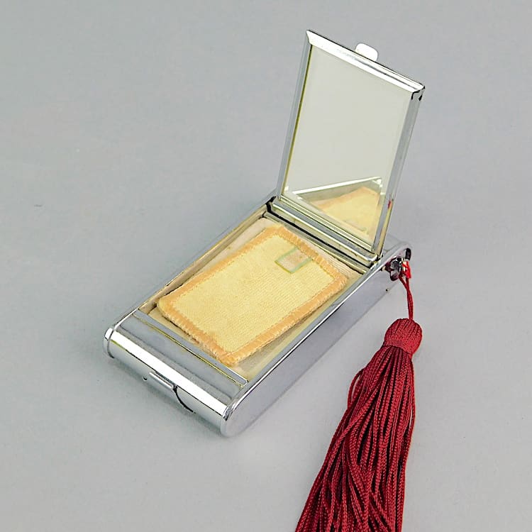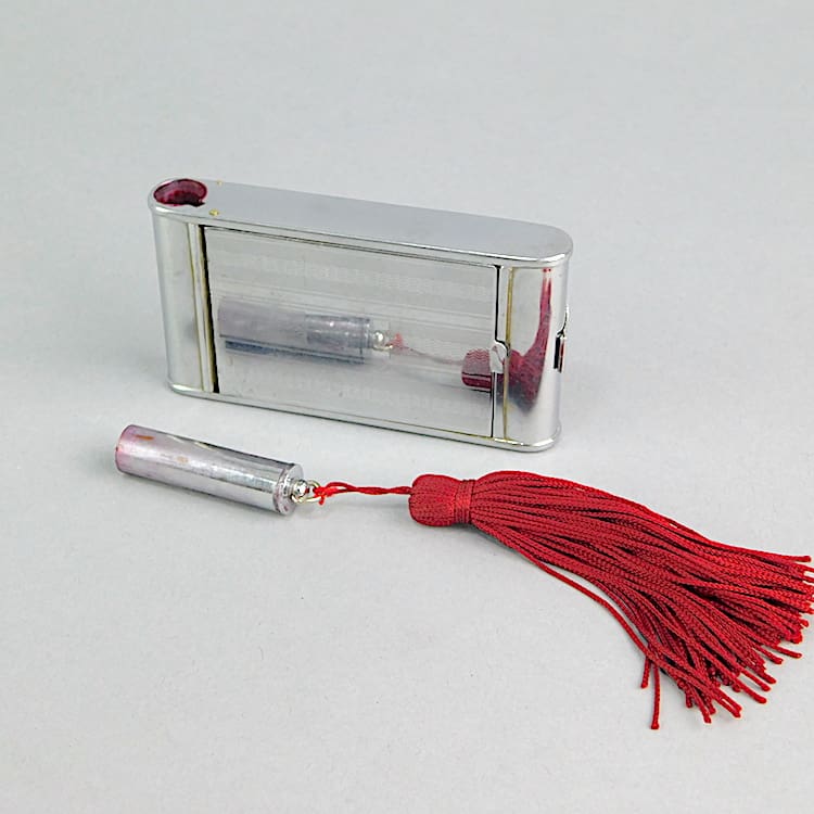 This chrome camera compact has the usual sections for cigarettes, lipstick and powder. Inside is a mirror, puff and mesh (unused). There is a red silk tassel.