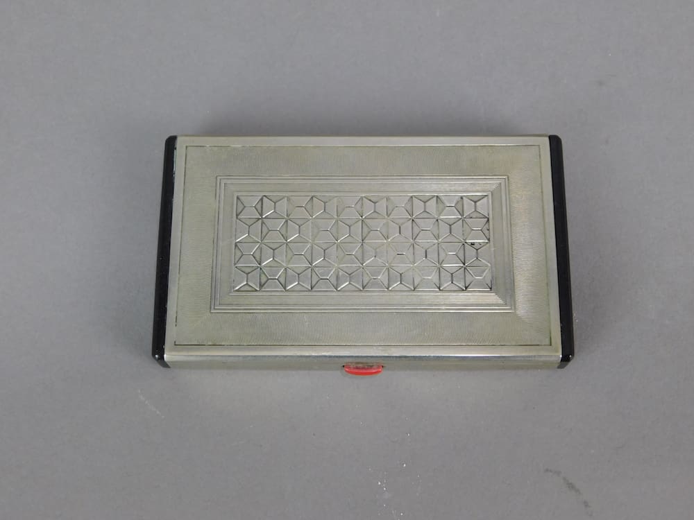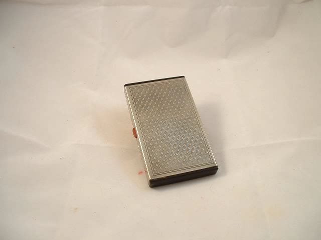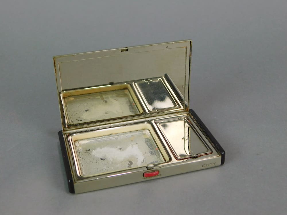 French Coty powder and rouge compact. Inside there are two sections and a reflective lid, no mesh or puff. The lid and base are engine turned metal and the ends are of black bakelite.