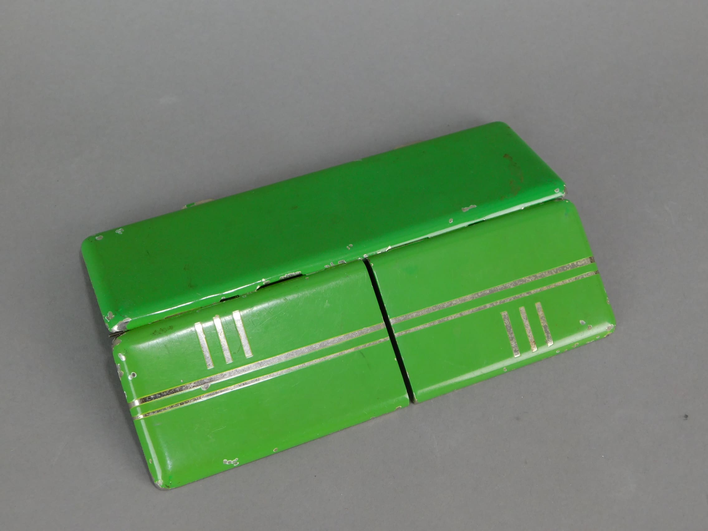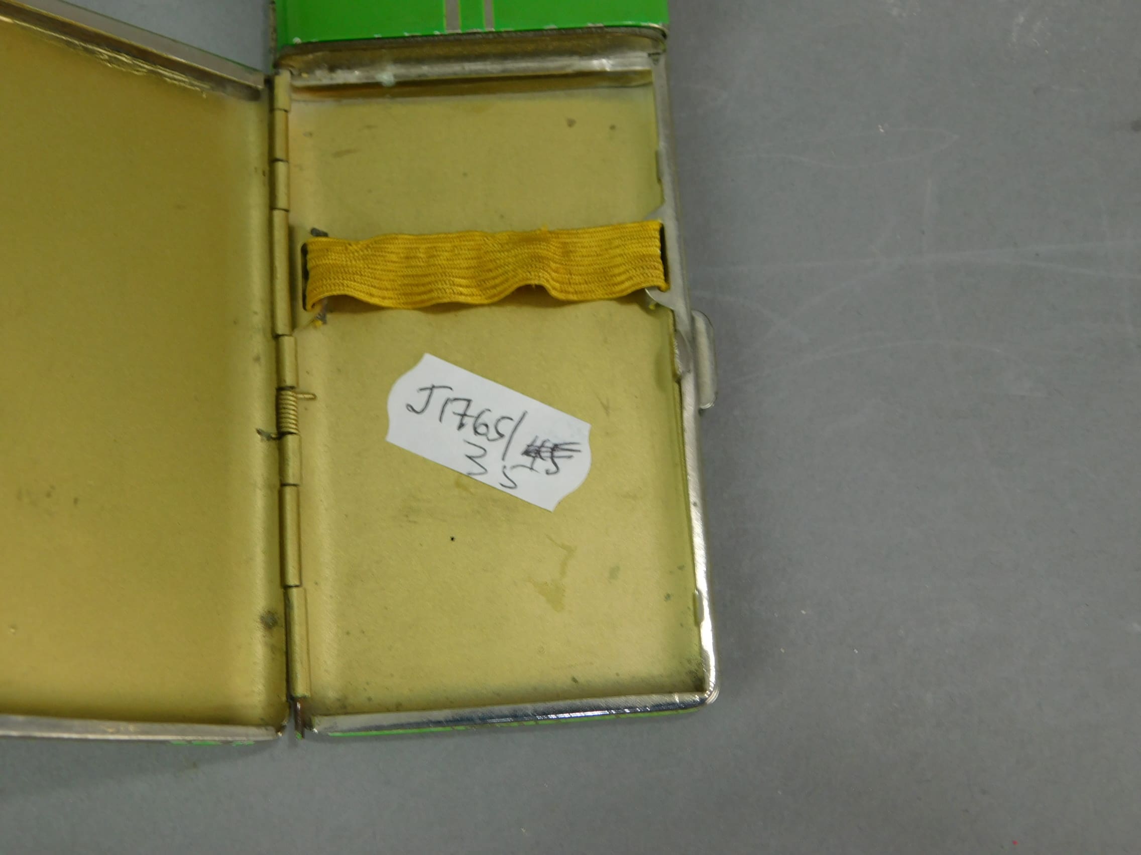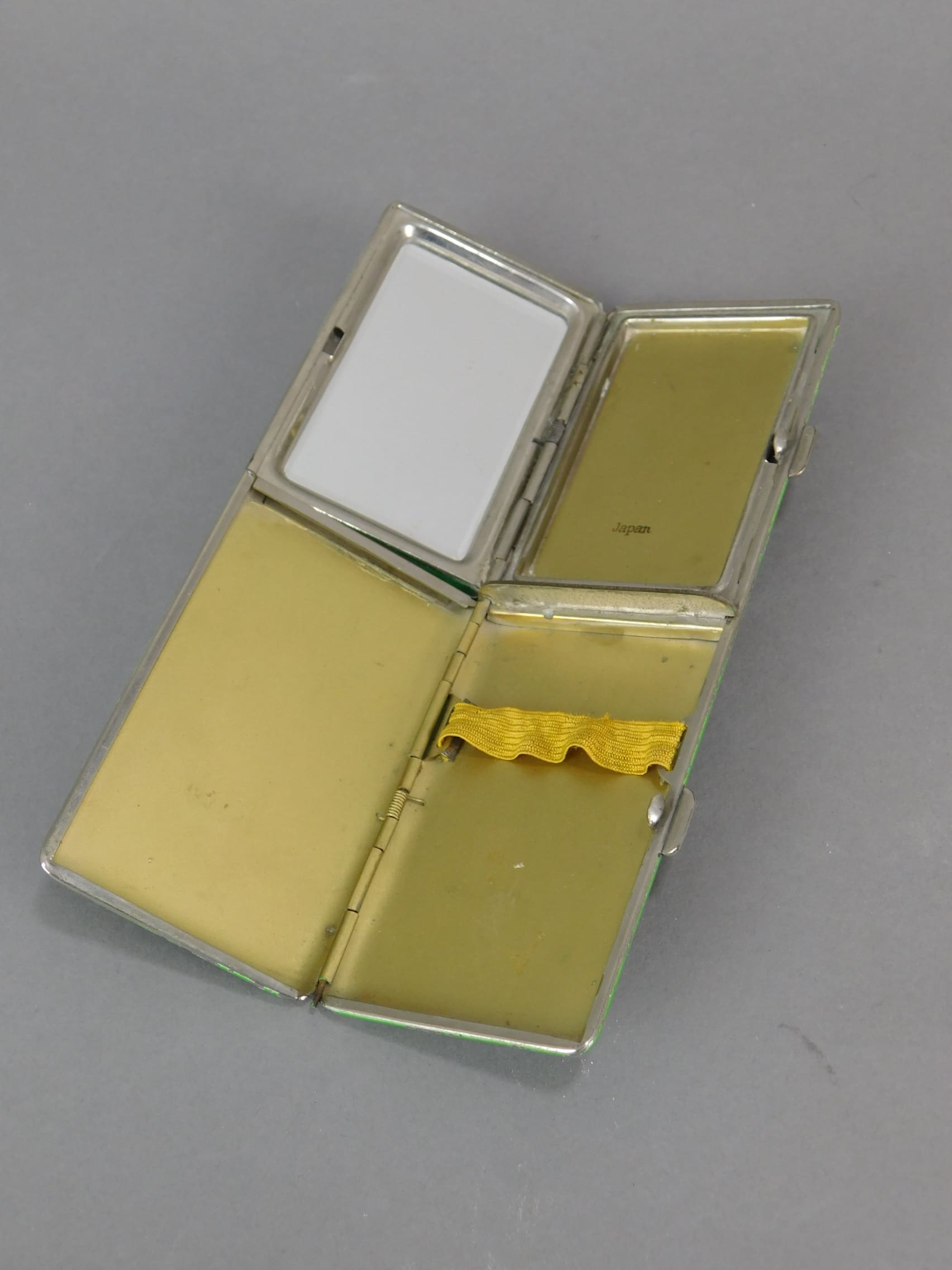 Green enamel long compact with one end for cigarettes or possibly business cards and the other for powder.