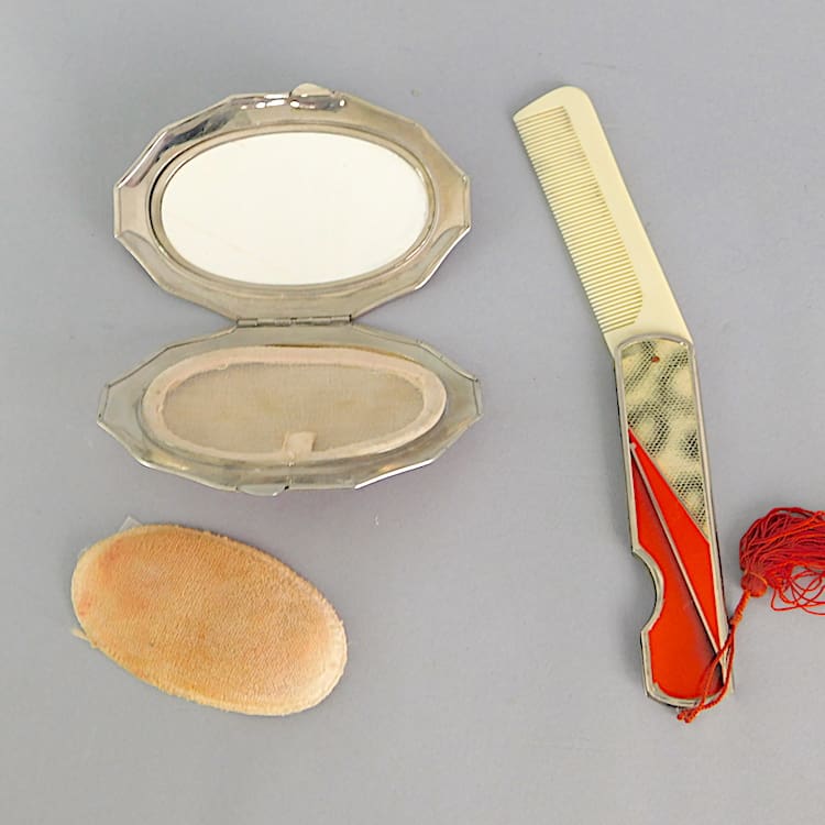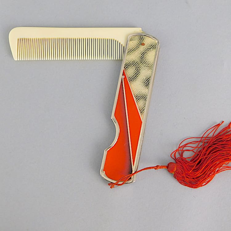 English cased red enamel and shagreen effect powder compact and matching retractable comb. Comes in its original navy velvet gift case.