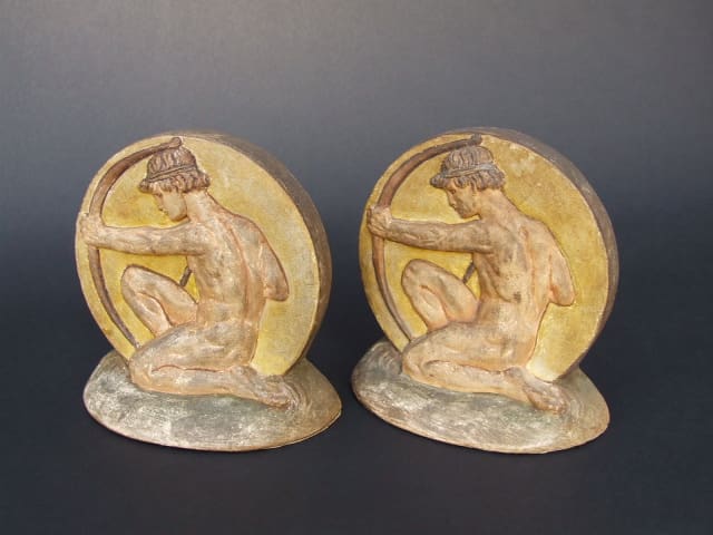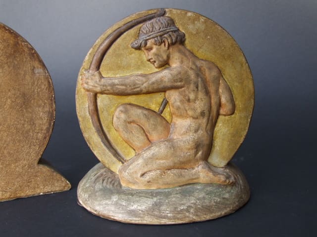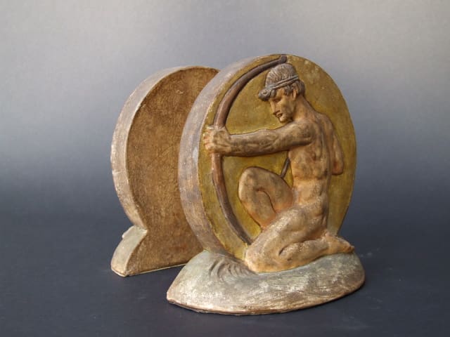 A pair of heavy white earthenware bookends from the Arts and Crafts period, unmarked but apparently by Compton Potteries. Male archers with green, yellow and brown tones.