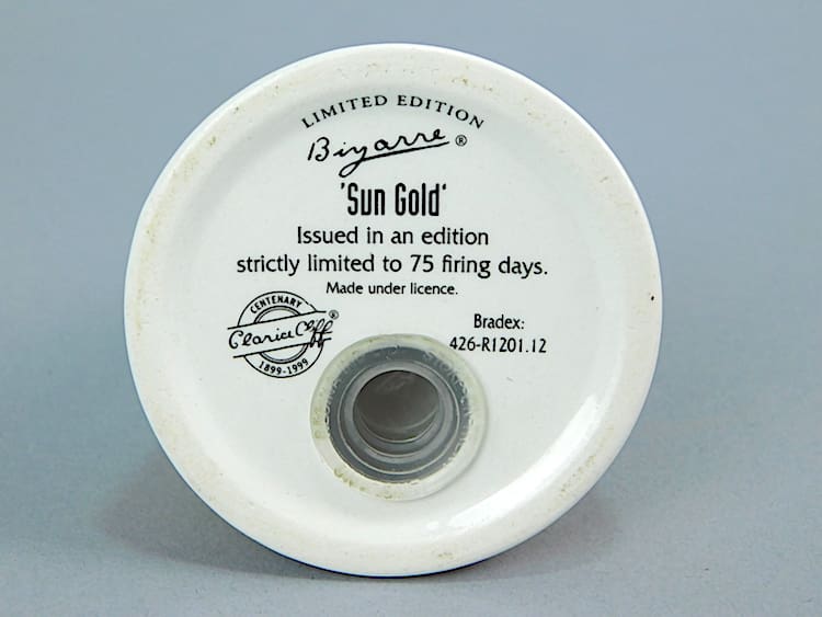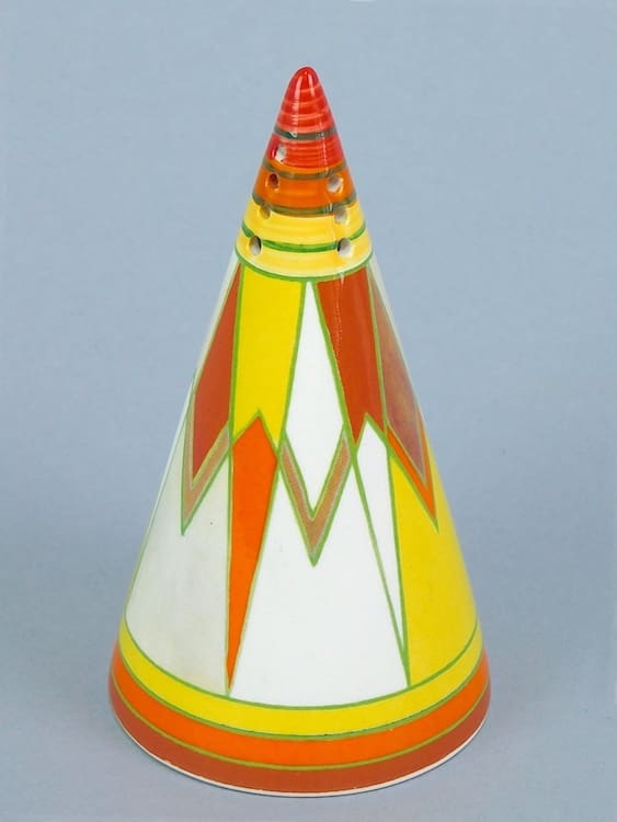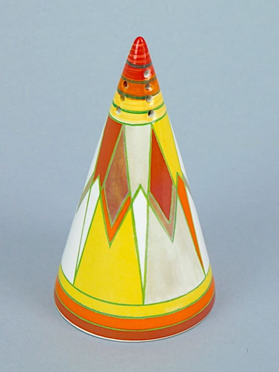 A ceramic sugar shaker – a reproduction in the style of Clarice Cliff and is marked under the base Bizarre, contemporary Clarice Cliff.