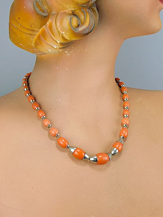 Coral coloured galalith beads sitting in chrome cups. Made in Germany by the Jakob Bengel company in the 1930’s.
