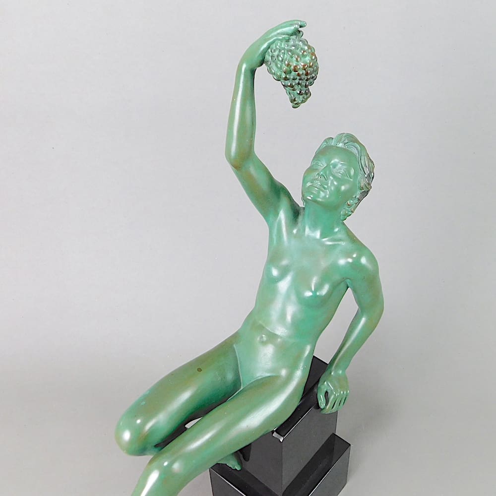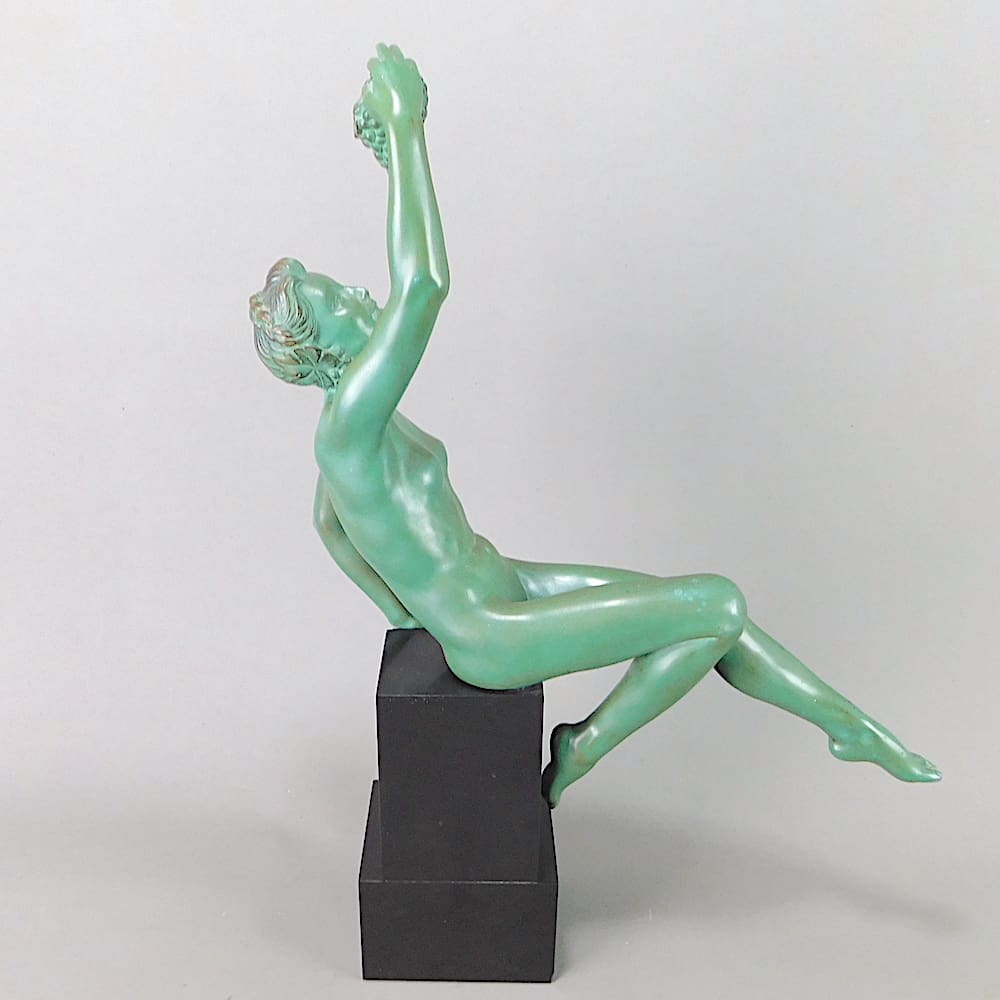 A French art deco statue by Max Le Verrier – a green patinated nude woman with grapes.