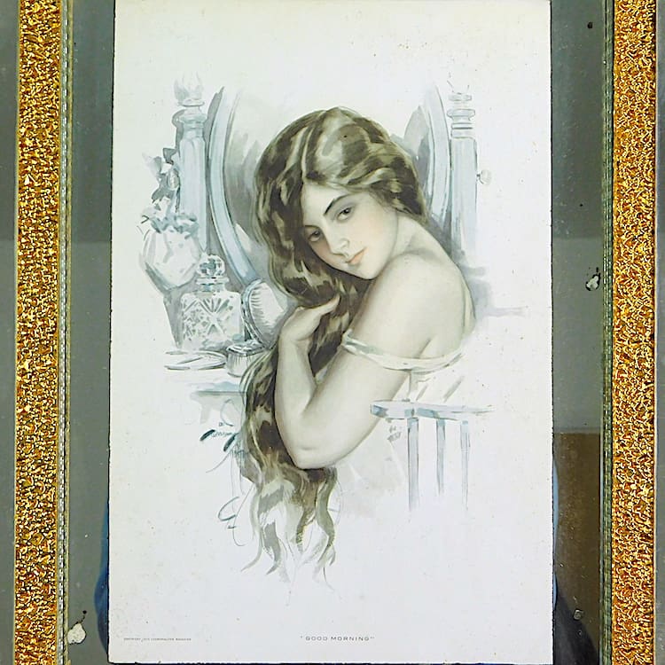 1915 art print “Good morning” by Harrison Fisher. Depicts a young lady brushing her hair in front of a dressing table. Framed in an ornate carved wooden frame with mirror glass detailing and gold dimpled glass framework.