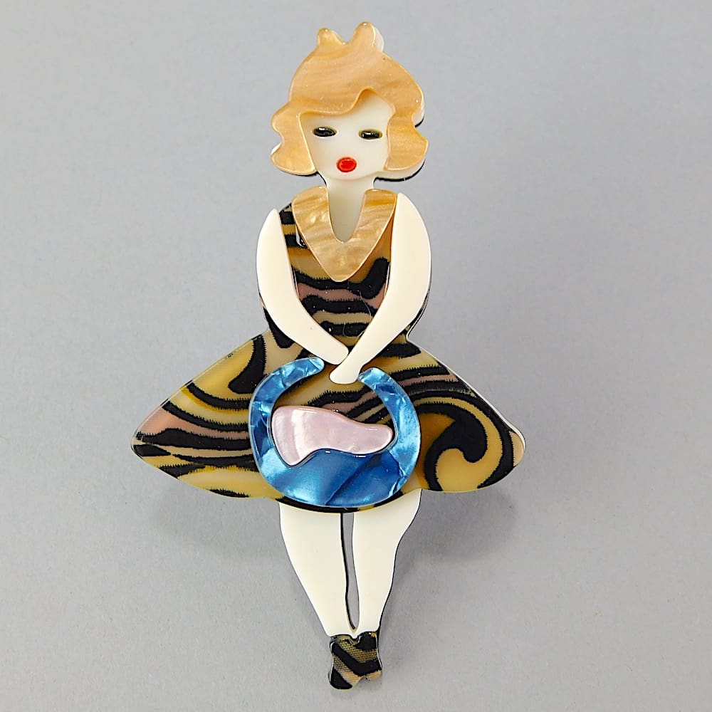 Celluloid brooch depicting a pin-up girl, fitted with a roll safety clasp.